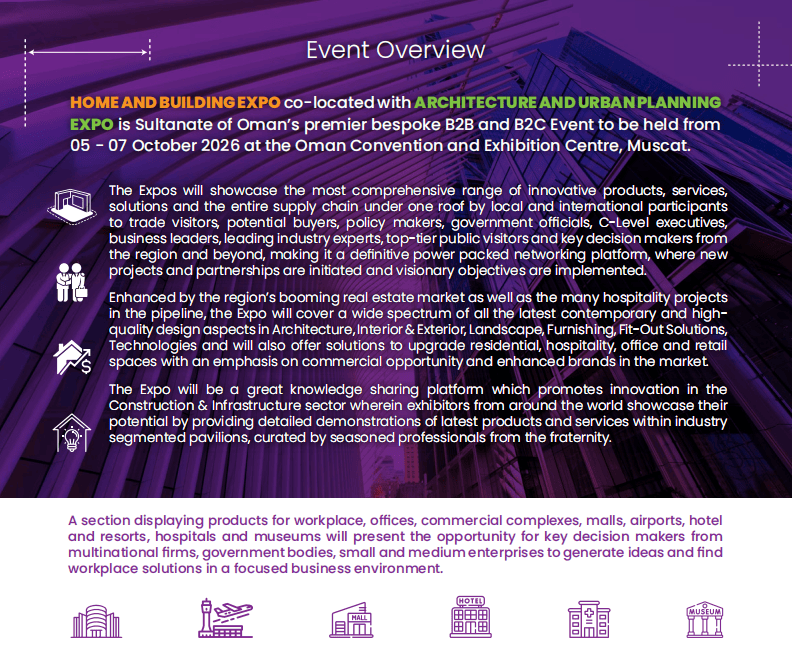 不妨抓住此次罕见的机遇。本届博览会由阿曼住房取城市规划部、Muscat Expo展览集团结合打制,展会同期的学问共享勾当,2026年10月5日-7日,